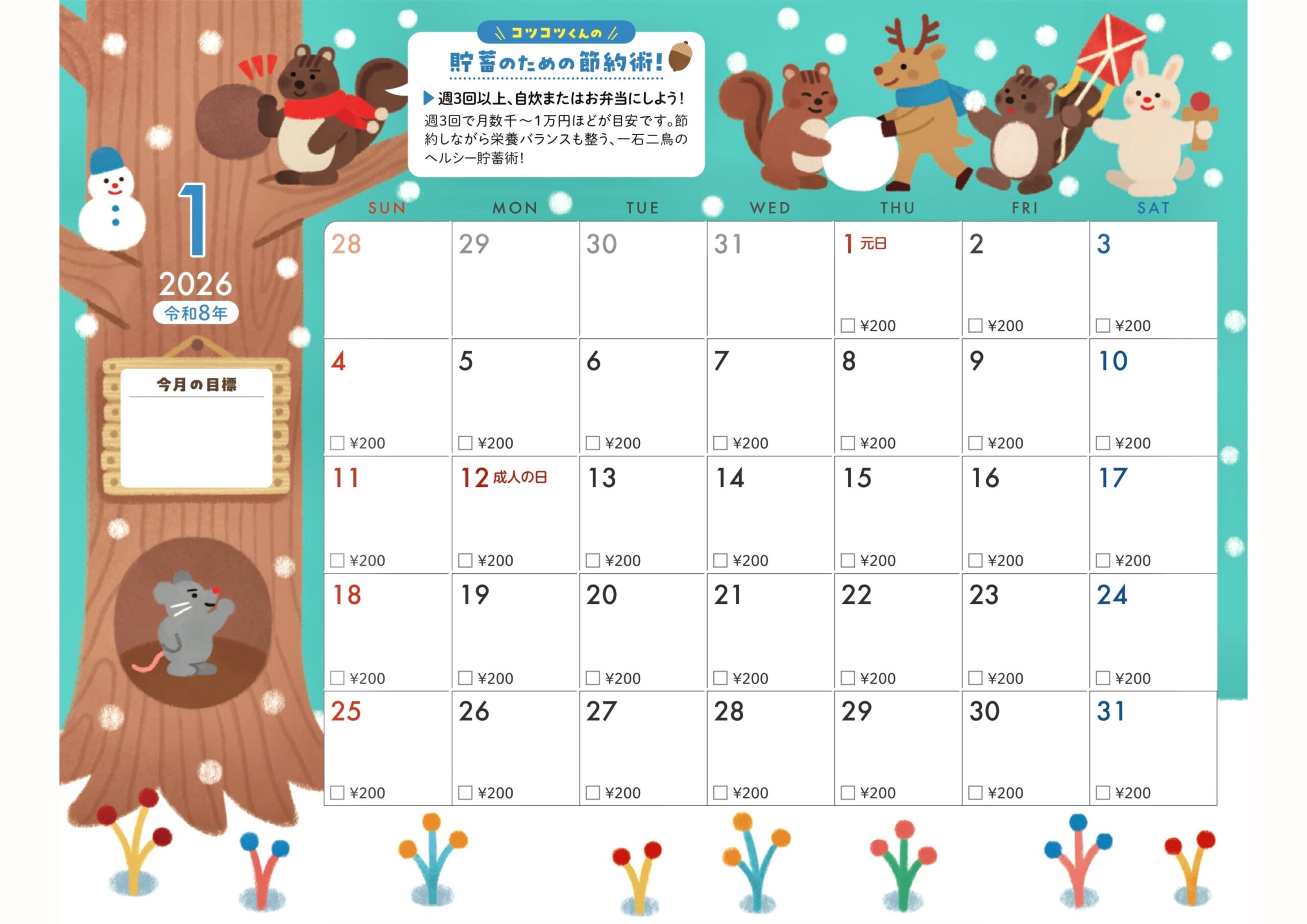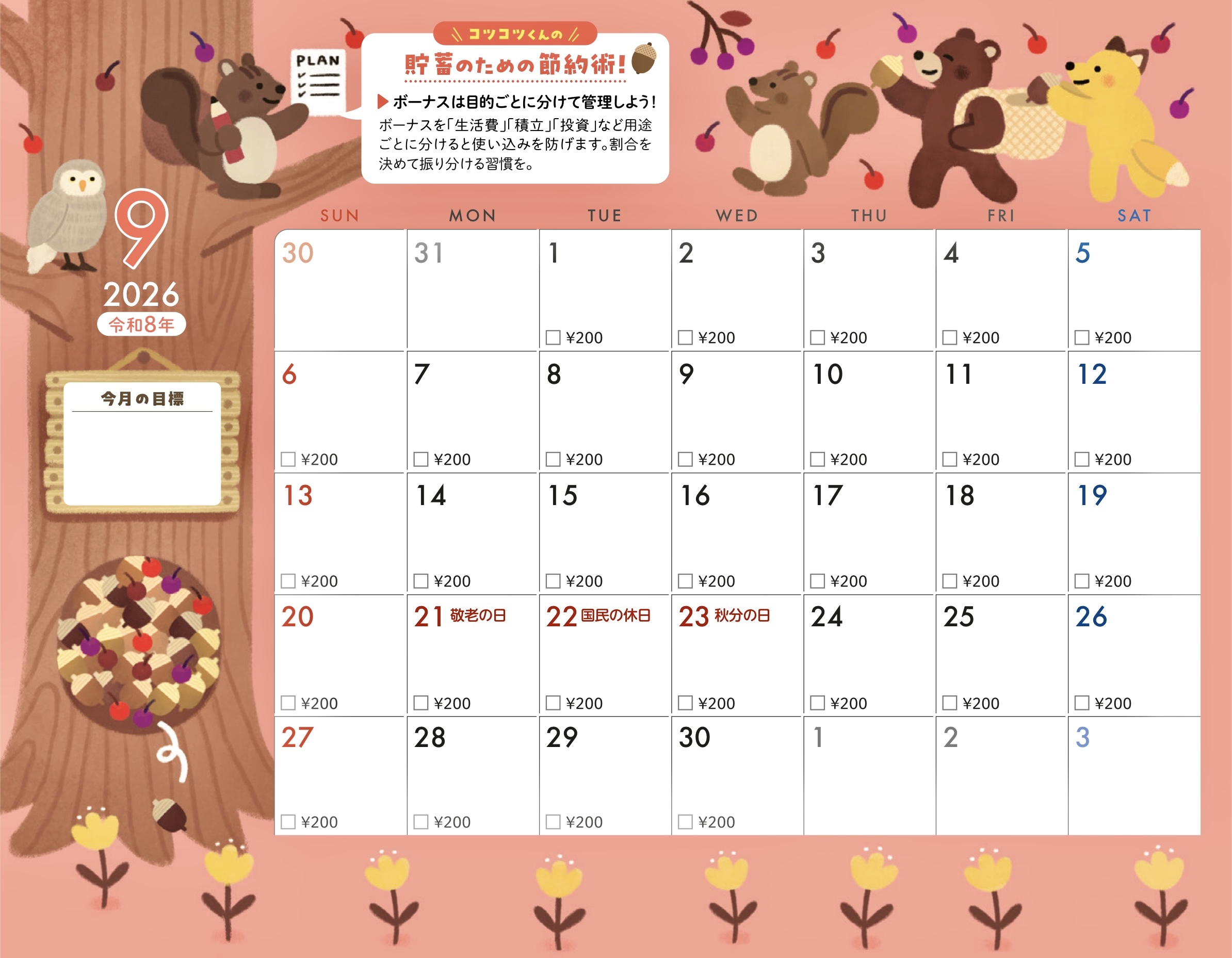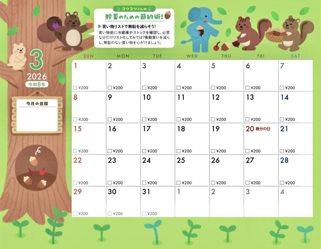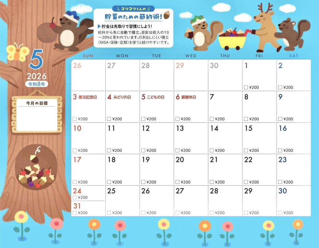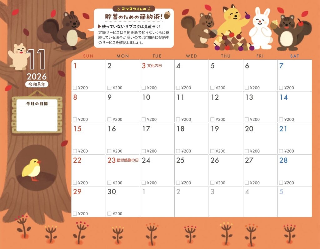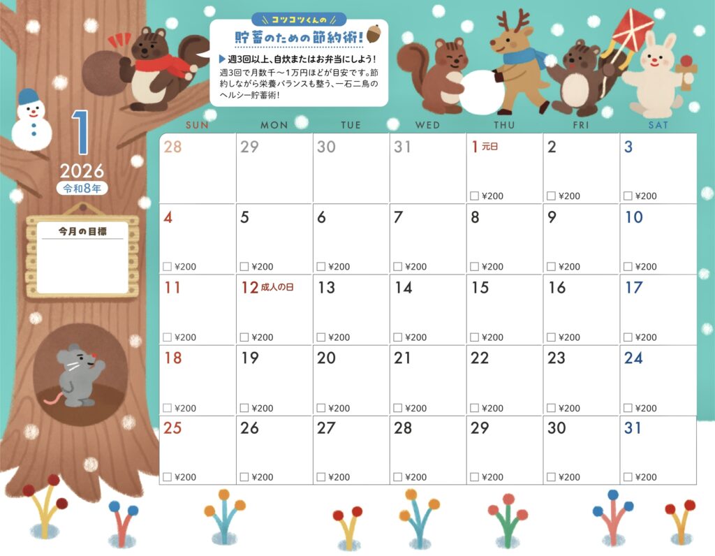 貯蓄カレンダー仕様になっていて今月の目標も書き込めます。