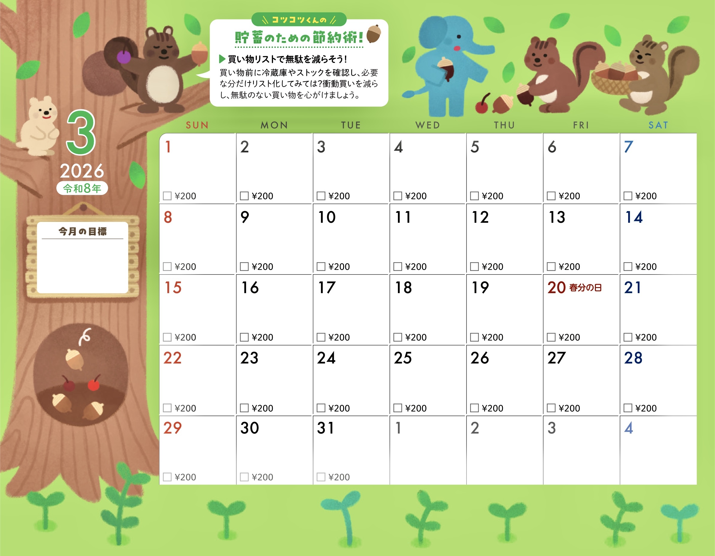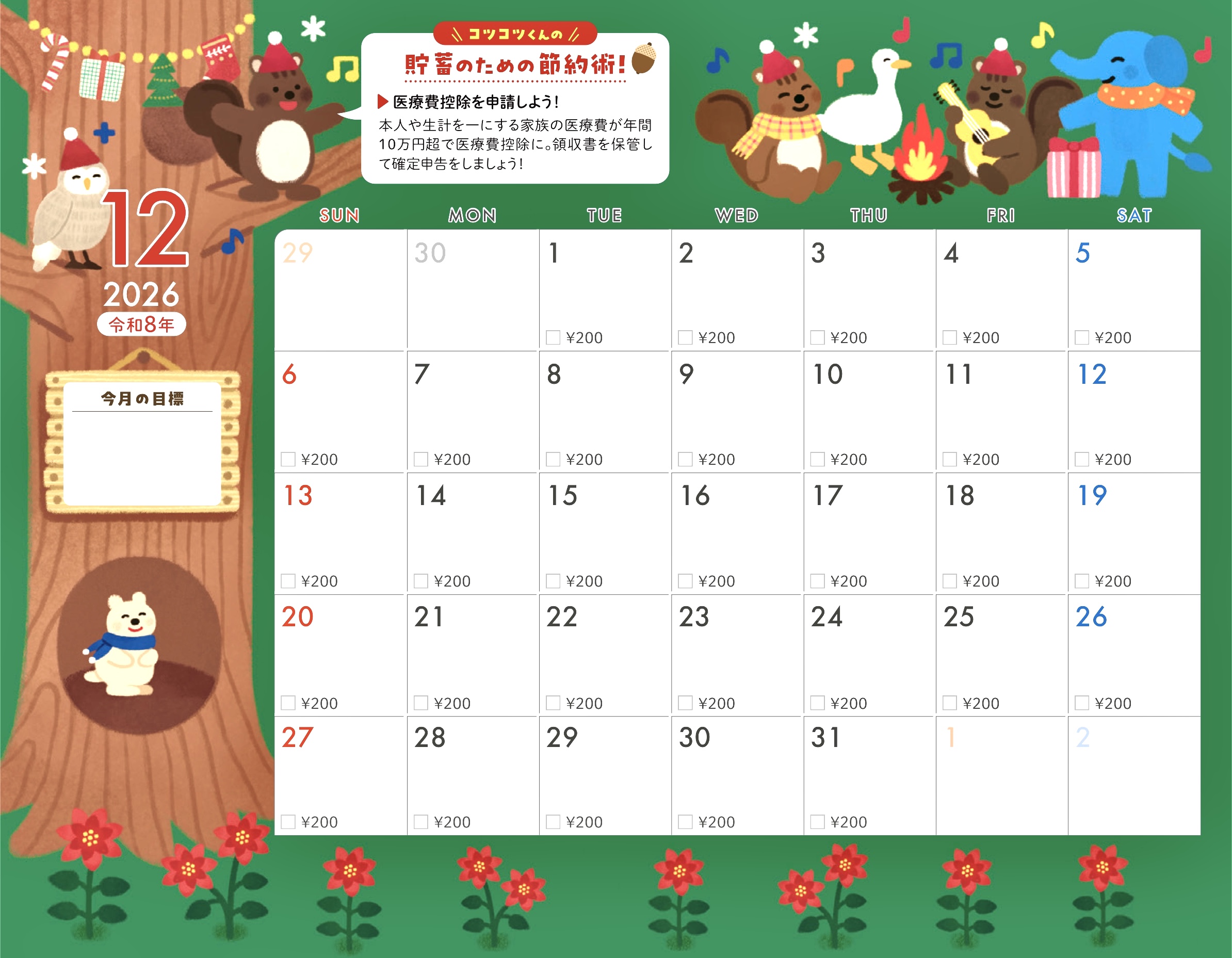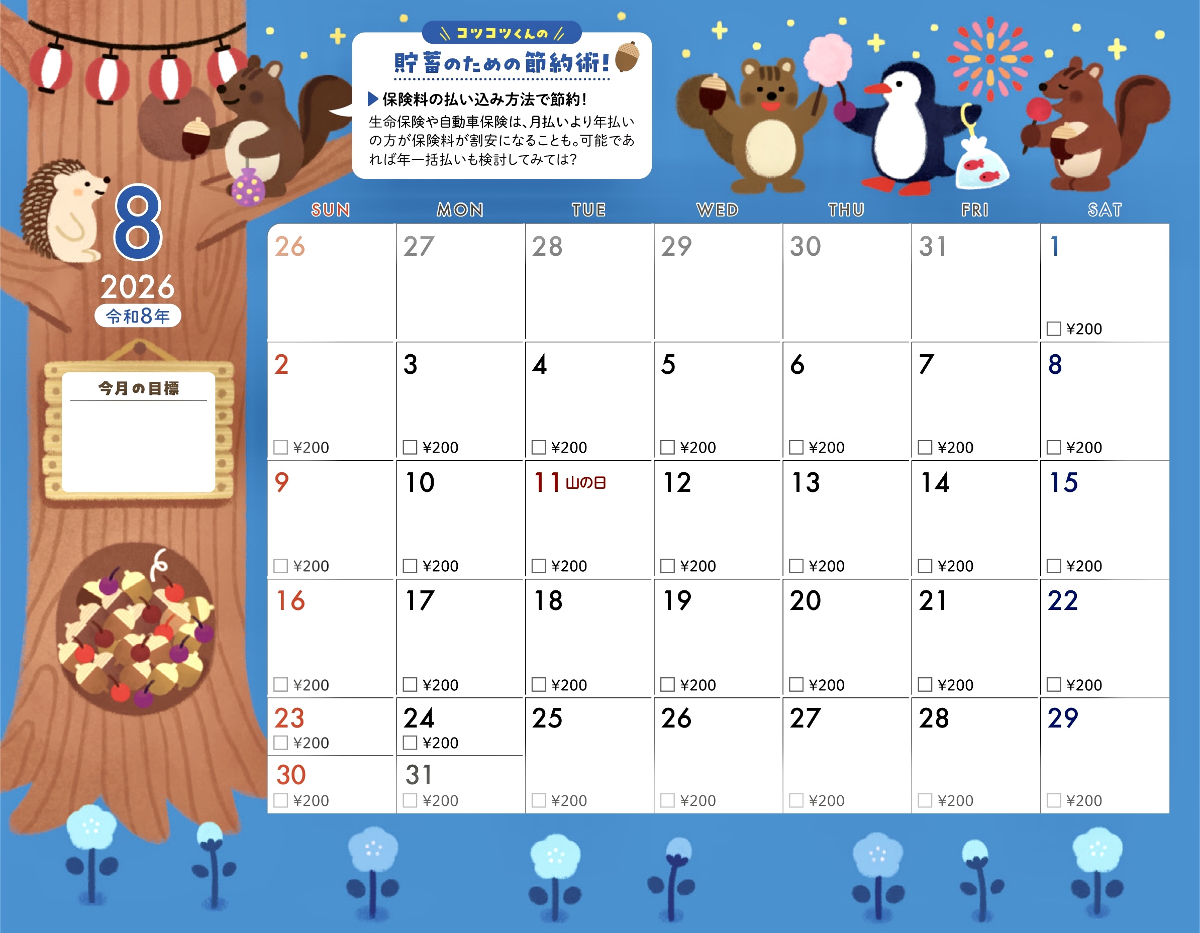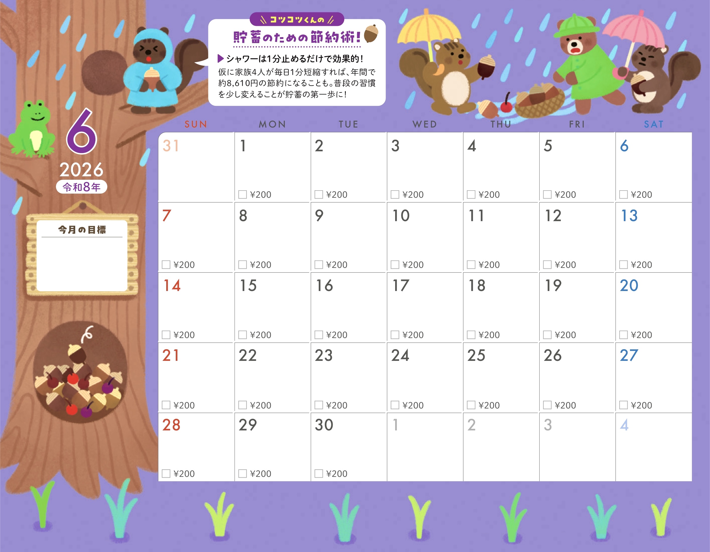 貯蓄カレンダー仕様になっていて今月の目標も書き込めます。