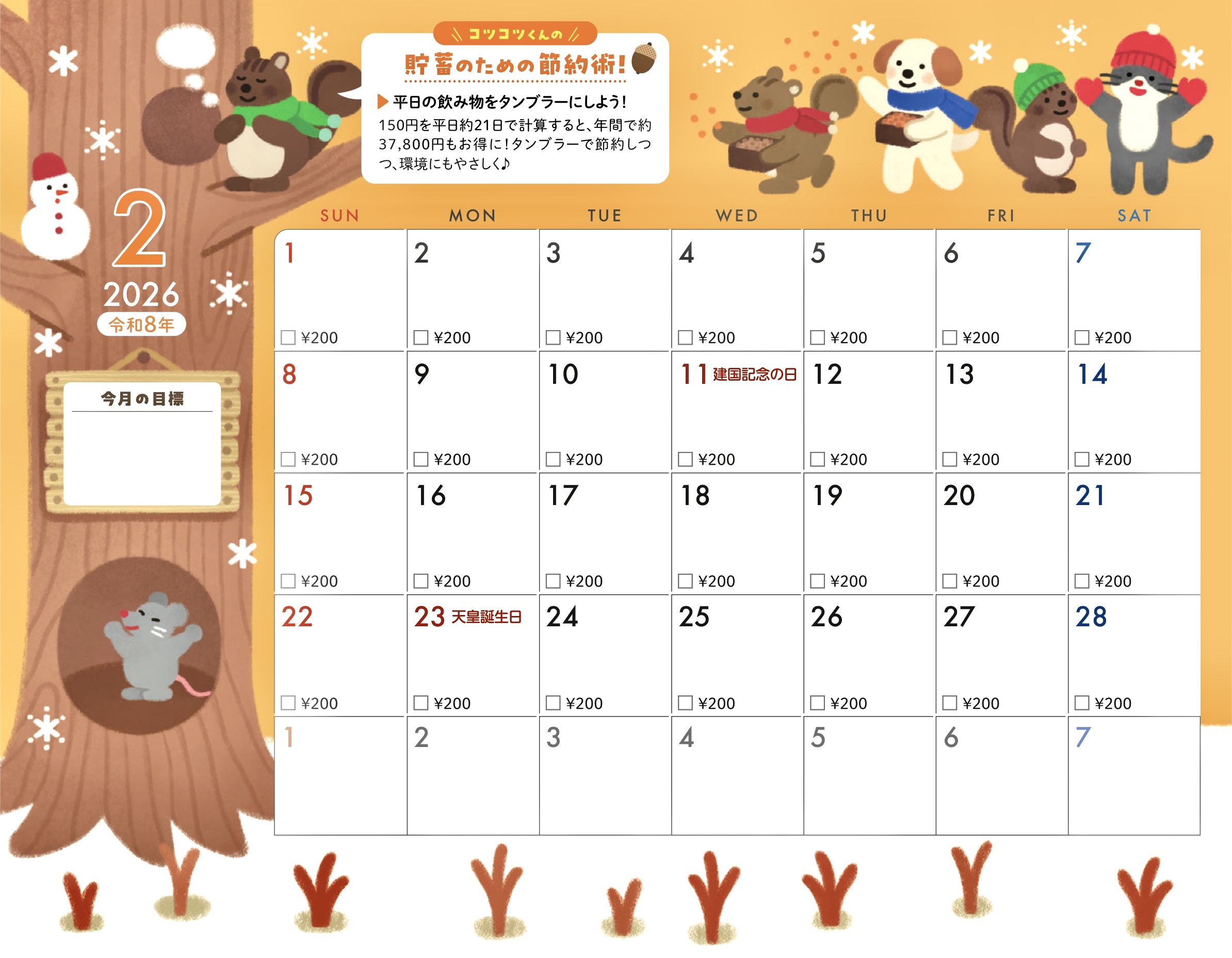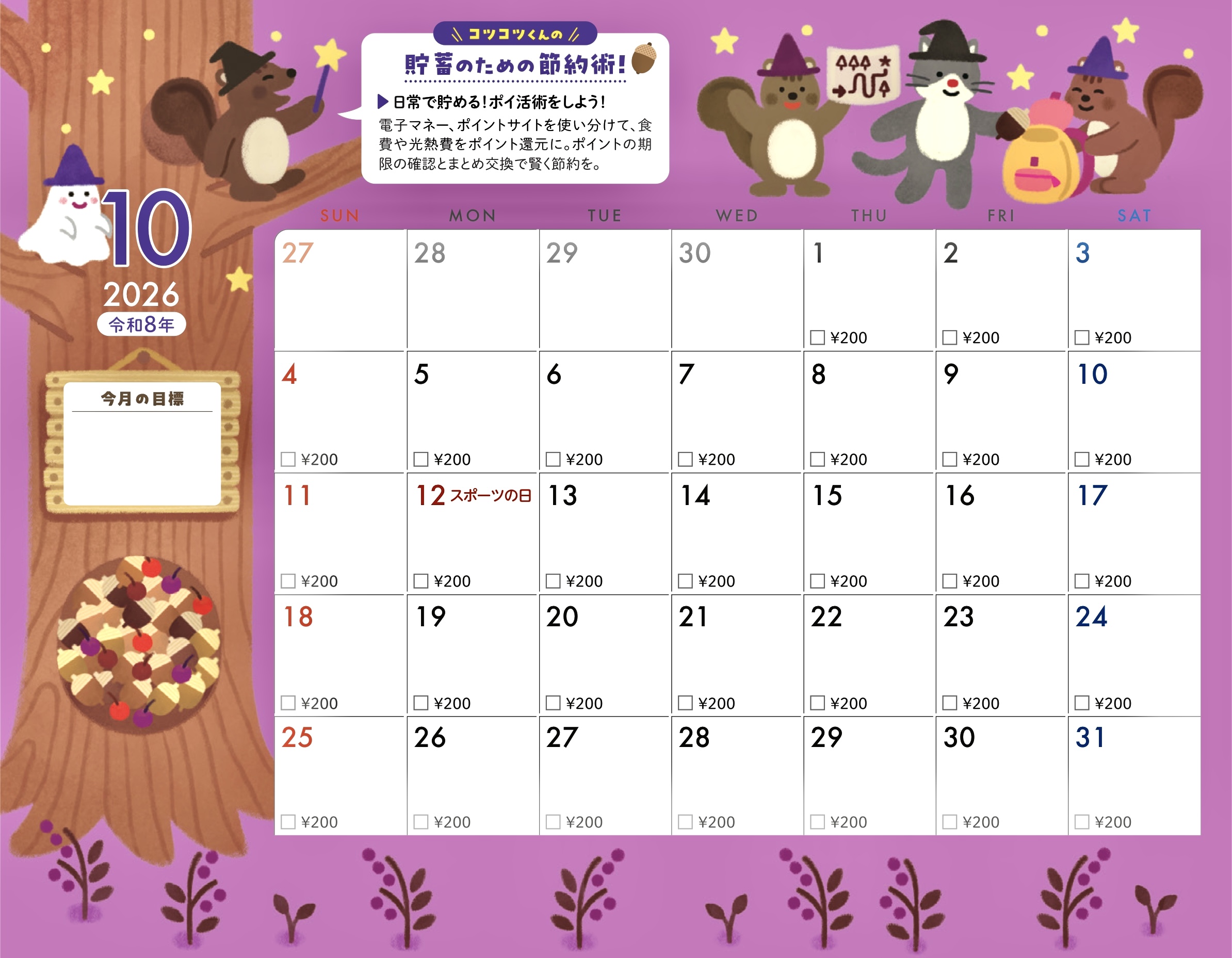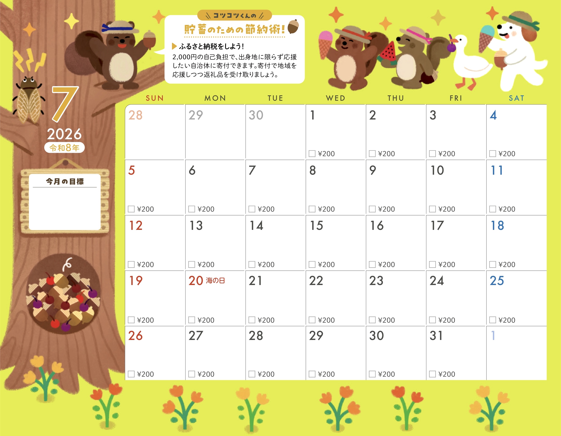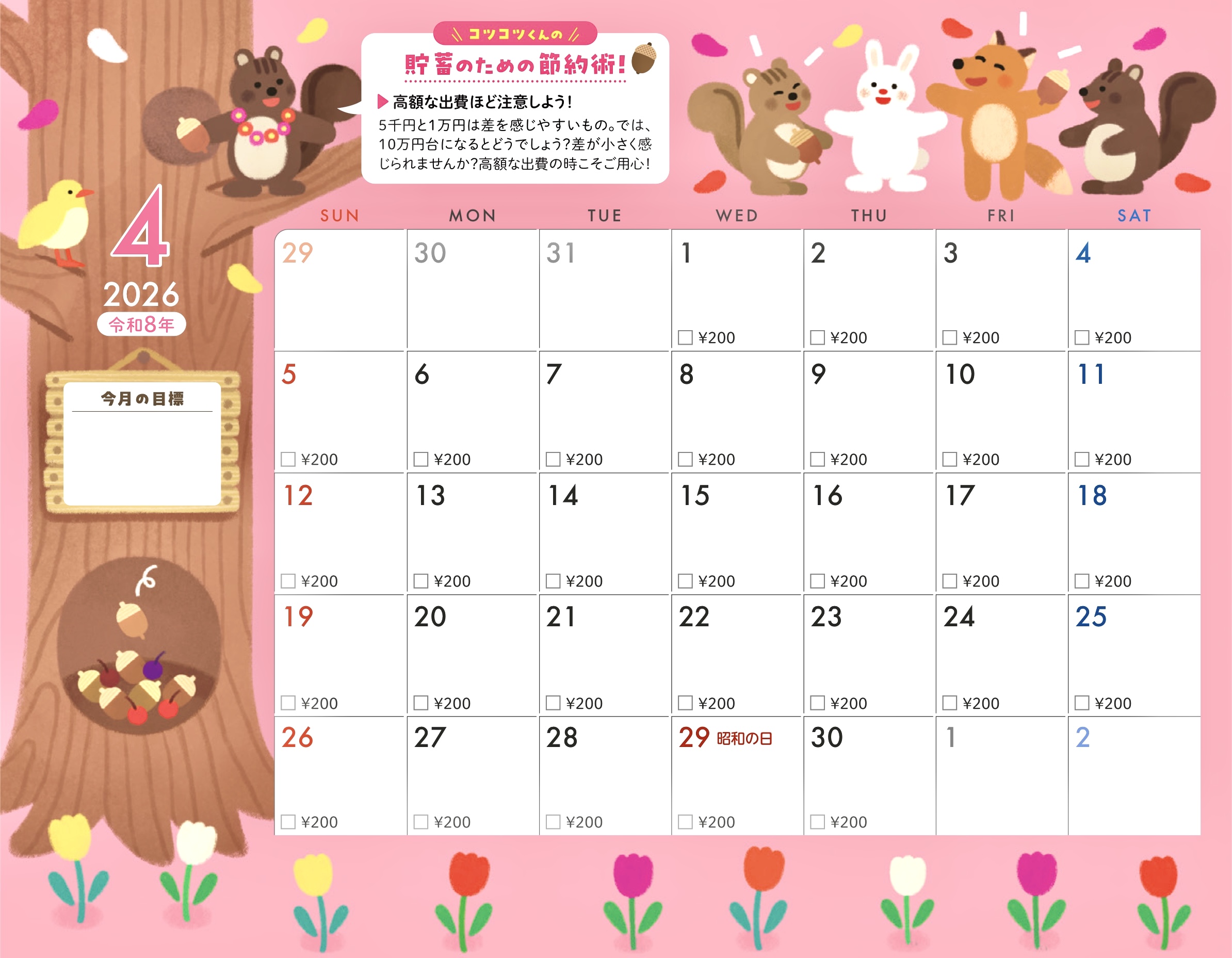 貯蓄カレンダー仕様になっていて今月の目標も書き込めます。