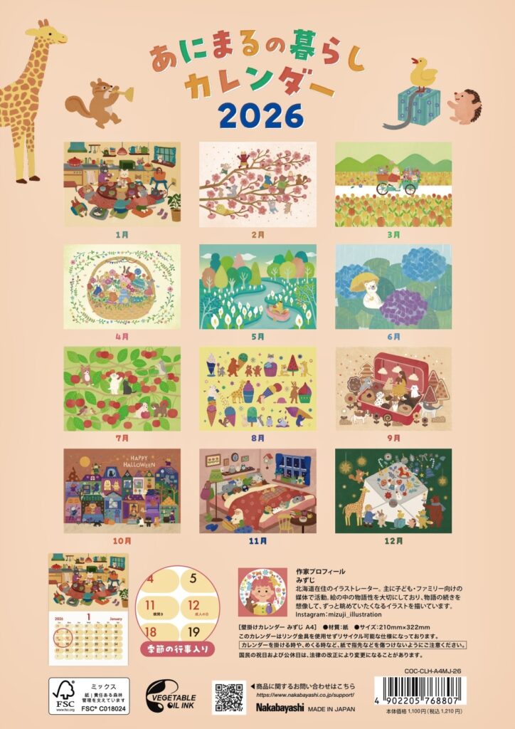 ナカバヤシ【あにまるの暮らしカレンダー2026】 2025.10.01 壁掛けカレンダーA4サイズのイラストを担当しております。 季節を楽しむどうぶつたちのイラストを使用していただいております。 Amazon.co.jp